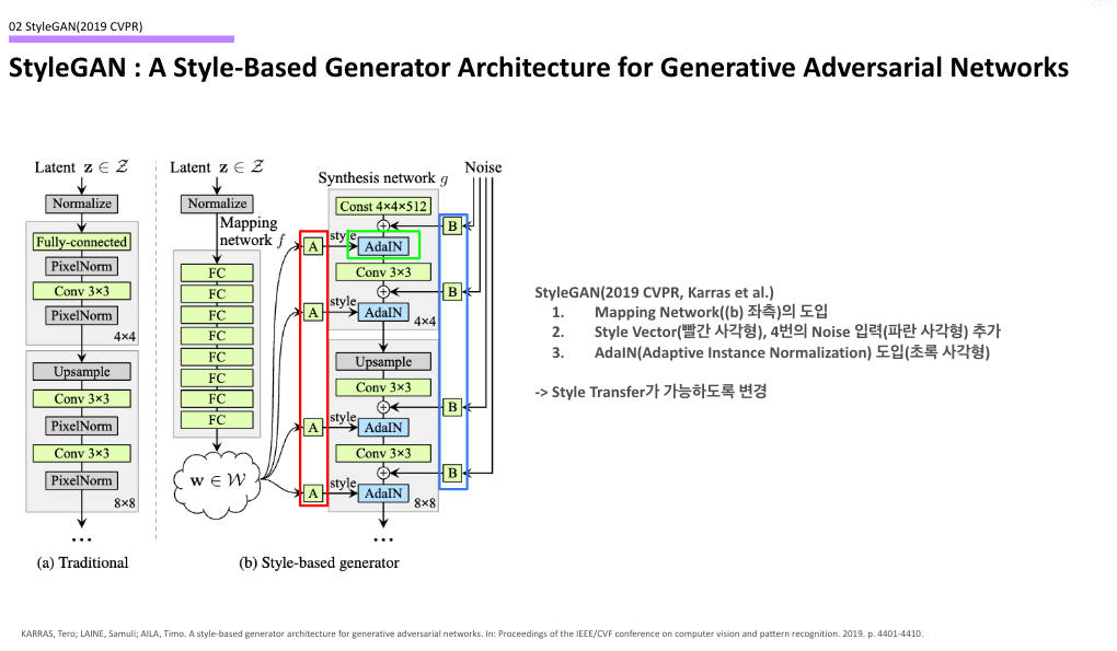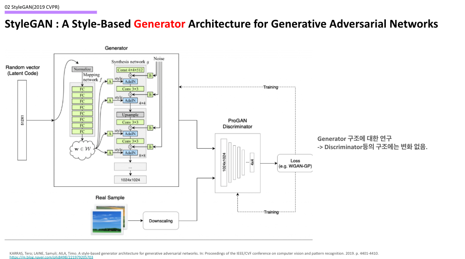 StyleGAN은 2019년 CVPR(Computer Vision and Pattern Recognition)에 소개된 NVIDIA 연구소의 논문으로써, 추후 이를 기반으로 한 Style Transfer model들과 이후의 모델 발달에 큰 영향을 기친 중요한 논문이다. 이는 직전 논문이었던 PG(Pro)GAN의 아키텍처에서 조금 더 Generator에 초점을 둔 연구로, 기존의 연구들이 Discriminator에 주로 치중하고 있던 것에 반대된다고 볼 수 있을 것이다.
