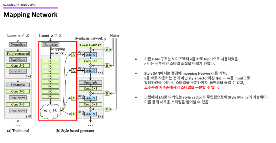 슬라이드에 나와있듯, 기존 GAN 구조는 노이즈벡터 v에 대해 이를 바로 input으로 사용하였기 때문에, 이러한 균일한 분포를 가지는 input은 세부적인 스타일 조절을 어렵게 만들었다. 하지만 StyleGAN은 중간에 FC Layer를 쌓아놓은 Mapping Network를 거치면서 비선형적 변환을 수행하였고, 각 스타일들에 대한 구분력을 높이고 조금 더 표현력 높은 특징들을 가지도록 한다. 또한, 이를 통해서 본 논문에서 가장 강하게 주장하는 'Style Mixing'이 가능하도록 된다. 이를 저자는 Latent Space에 대해서 Disentanglement를 수행한다고 한다. 결국 vector 사이의 seperability를 추구한다는 것이다.