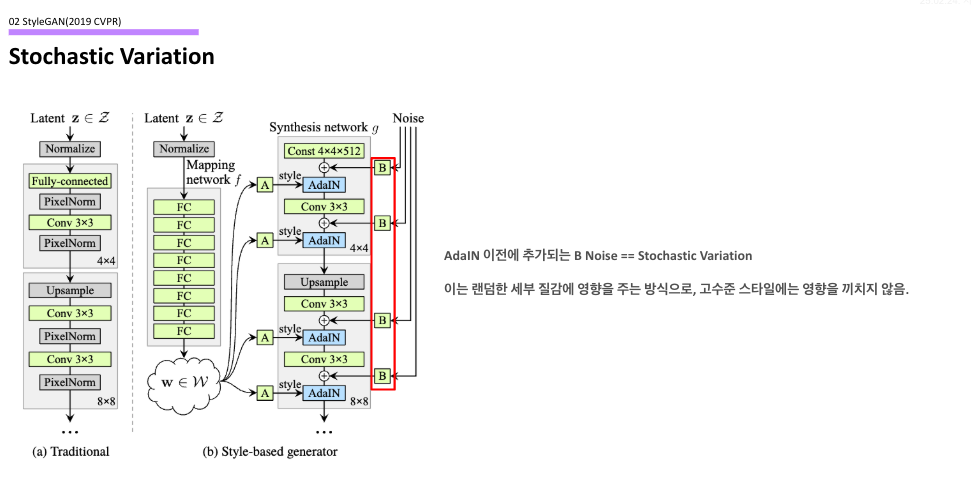 - 이를 통한 Style Vector의 추가, 그리고 Noise Vector(=>Stochastic Variation)의 추가