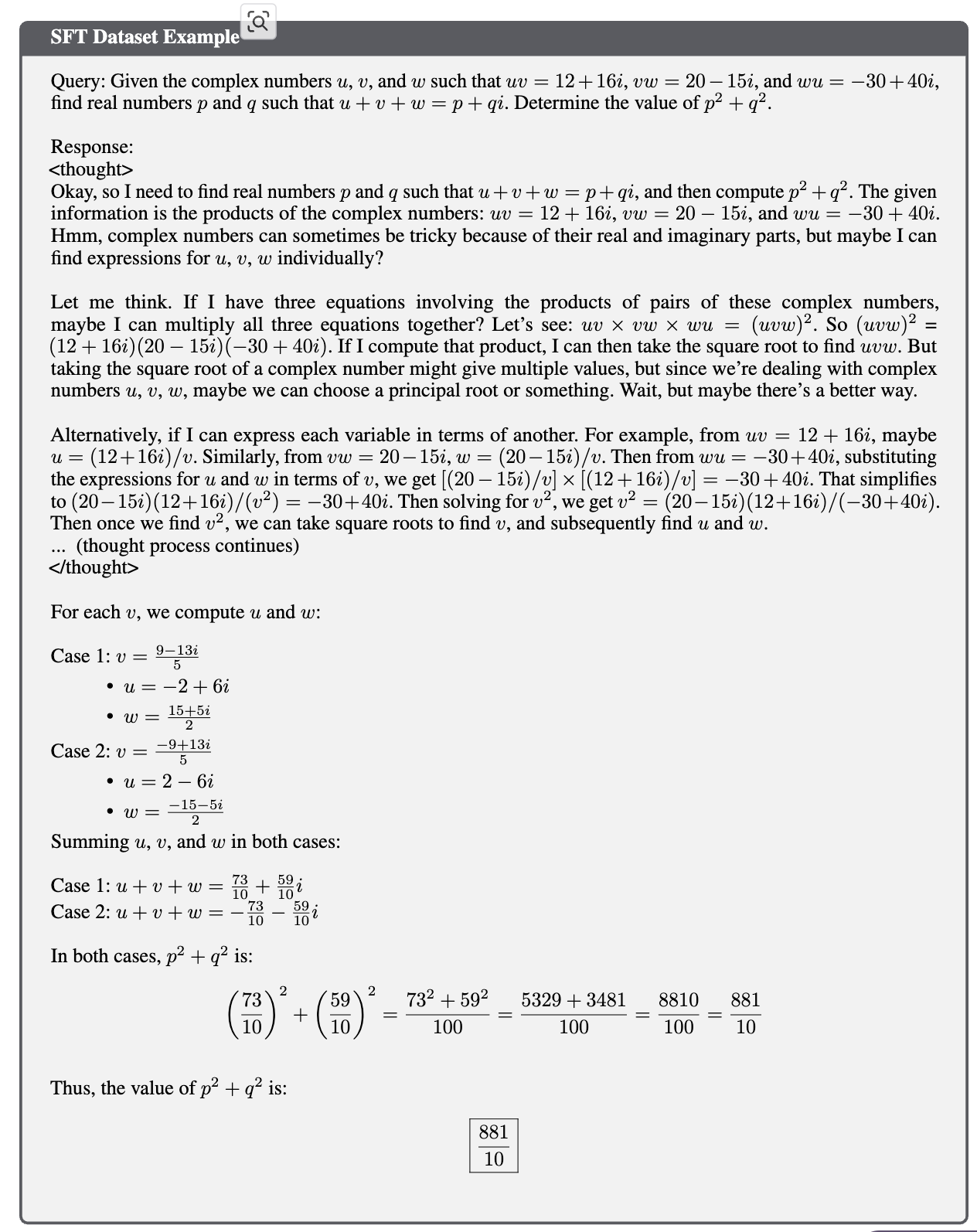 위의 데이터셋을 한 번 보도록 하자. 이 때 주목할만한 점은 모델이 답변을 생성할 때, <thought> </thought> 내에서 스스로 문제 풀이를 위한 논리적 과정, 자기검증, 오류 수정 등을 수행한 후, 실제 결과 출력은 최종 정답만을 간단히 제시할 수 있다는 데에 있다. 이렇게 학습하였기 때문에, 복잡한 문제를 해결해야 한다고 해도 명확하고 정확하게 풀이할 수 있도록 만들 수 있었던 것 같다. Hallucination을 줄이기 위한 방식이라고 할 수 있고, 사람으로 치면 '말하기 전에 생각하기'를 학습했다고 할 수 있다. 이는 Chain-of-Thought 방식을 사용한 것으로도 판단할 수 있을 것이다.